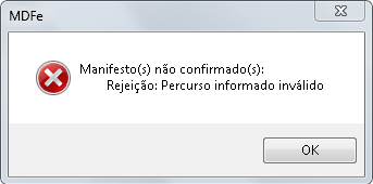 A mensagem apresentada é referente ao percurso informado no MDF-e. Existem duas possíveis causas para esta mensagem: