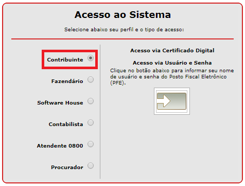 2. Marque a opção de contribuinte, você poderá acessar com o certificado ou com usuário e senha do posto fiscal.