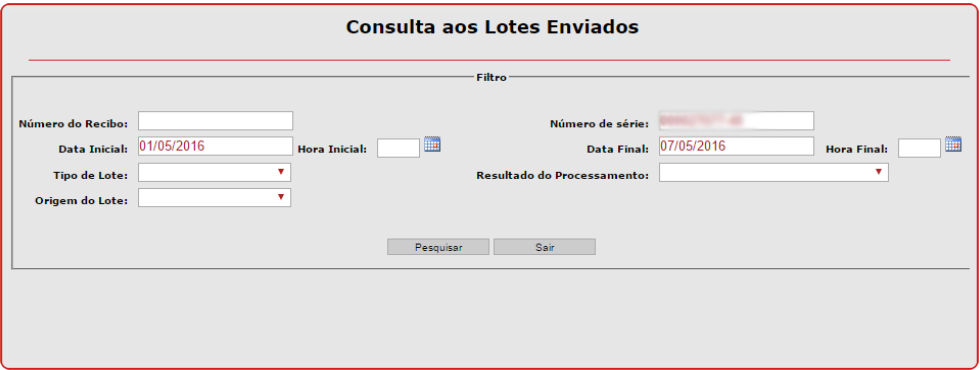 4. Defina o número de série do SAT, coloque a data Inicial e Final que deseja pesquisar os XMLs em lote dos CUPONS emitidos e cancelados.