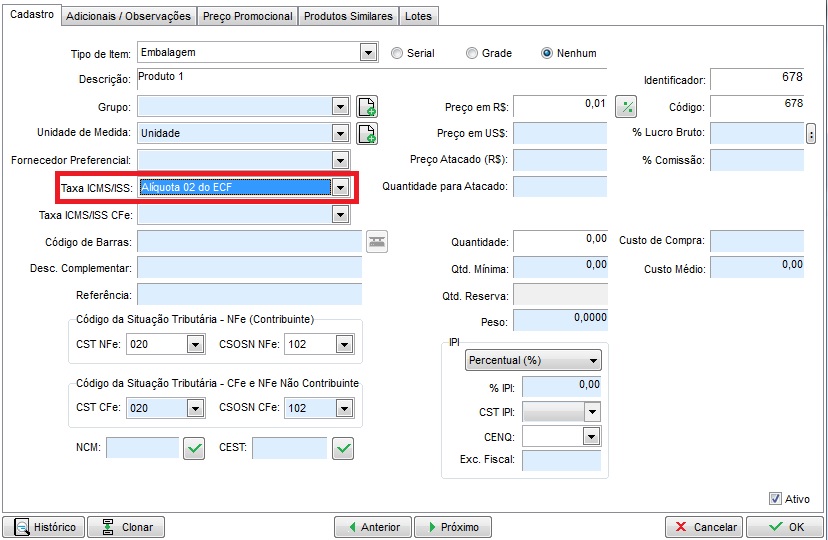 Agora consulte seu contador para saber qual alíquota deverá utilizar nas vendas dos seus itens. Com esta informação, acessamos o cadastro do produto no estoque e no campo Taxa ICMS/ISS definimos a posição da alíquota correspondente;