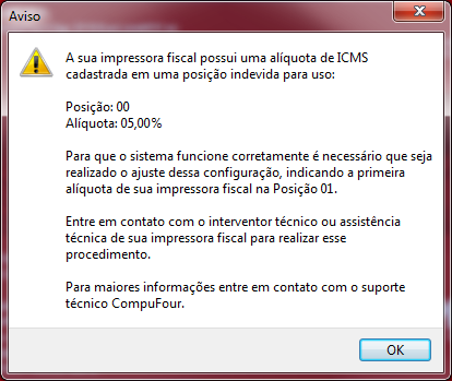 Ao abrir o Emissor de Cupom Fiscal apresenta a mensagem informando que tem uma alíquota cadastrada em posição indevida, ou seja, cadastrada na posição 00 da impressora.