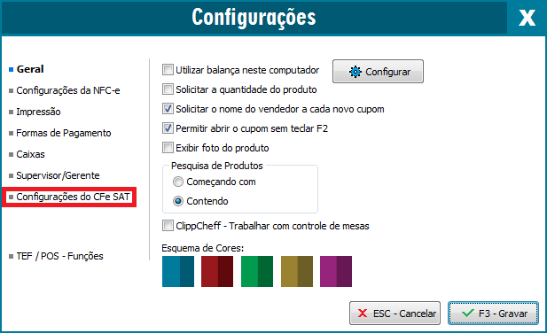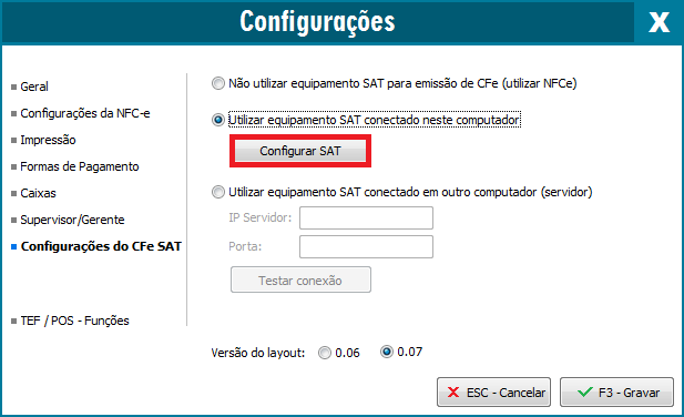 Clique na opção Configurações do CFe SAT: