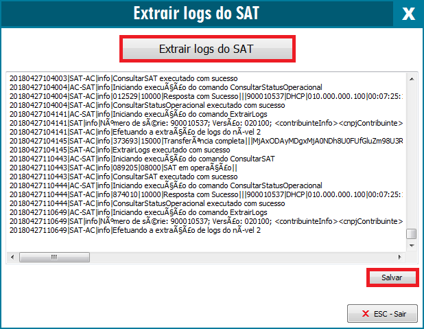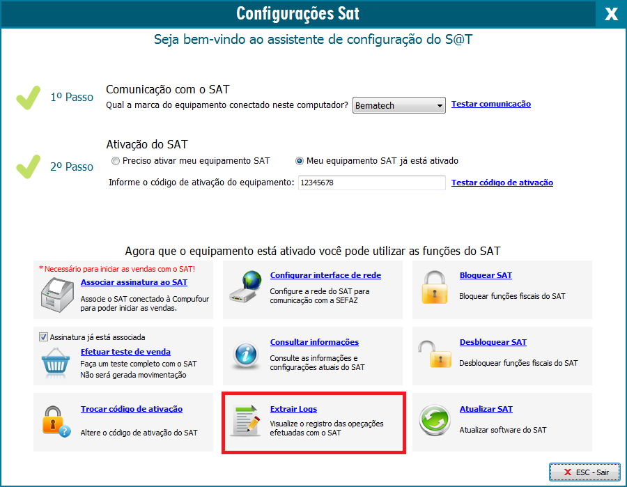 Agora vá até a opção Extrair logs do SAT para que sejam geradas as informações de LOG:
