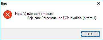 Com o novo leiaute da nota 4.0 ao emitir uma NFe e informado uma alíquota de FCP diferente da alíquota definida pelo Estado poderá apresentar a mensagem: