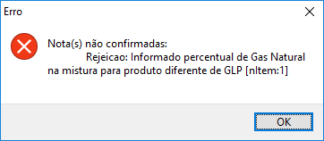 Com o novo leiaute da nota 4.0 ao emitir uma NFe informando a %GLP, %Gás natural nacional e %Gás natural importado no produto que não for o código ANP 210203001 apresentará a mensagem: