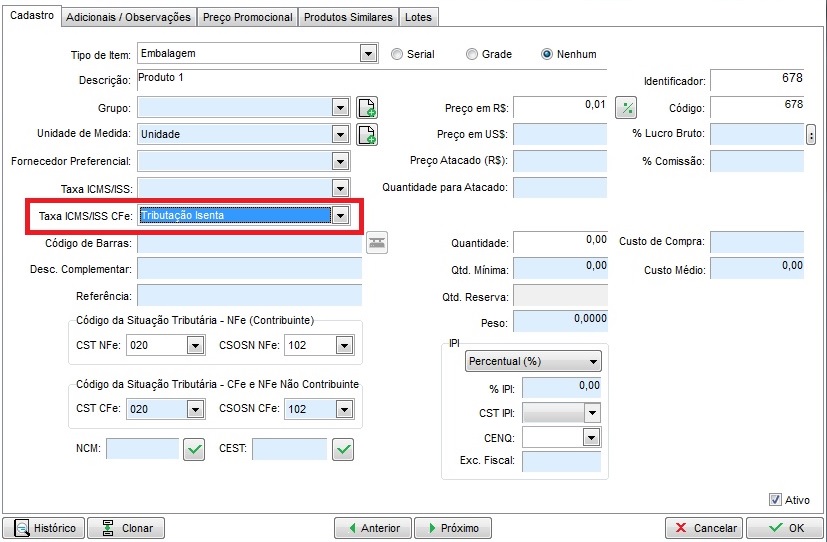 1 - Abra o cadastro dos produtos que estão na NFC-e no módulo de estoque e localize o campo "Taxa ICMS/ISS CFe: