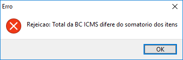Rejeição: "Total da BC ICMS difere do somatório dos itens" ao emitir NFC-e.