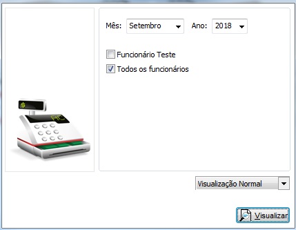 Abrirá a tela para preencher o período e se deseja gerar relatório de um funcionário, ou de todos, após preencher, clique no botão Visualizar, é permitido visualizar em Excel, Calc, HTML ou apenas visualização normal.