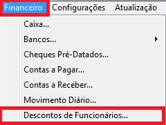 Após efetuar o cadastro do funcionário, clique no menu Financeiro e após em Descontos de Funcionários...
