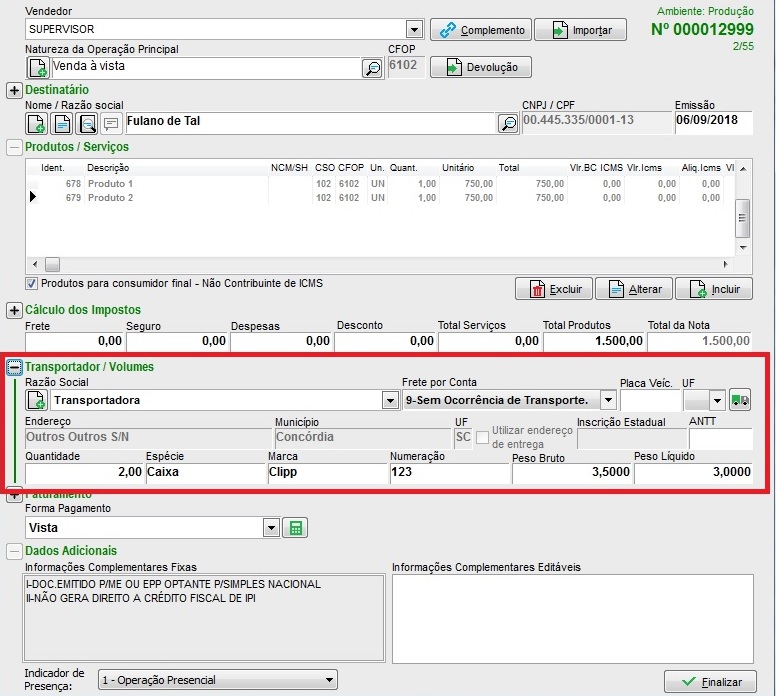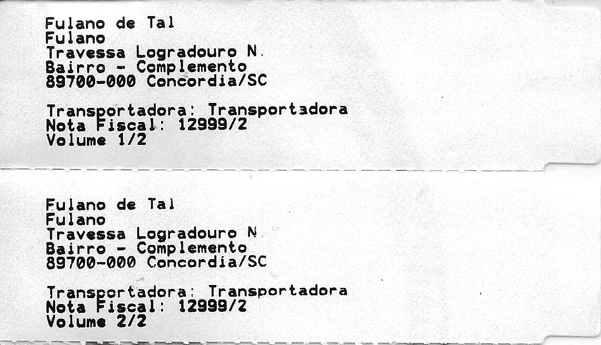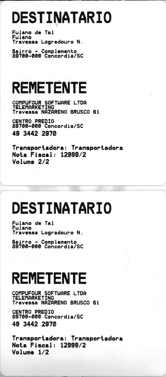 A quantidade informada no campo de volumes vai corresponder a quantas etiquetas serão impressas, no exemplo da nota acima foram informadas duas quantidades, neste caso, serão impressas duas etiquetas uma para cada volume em questão.