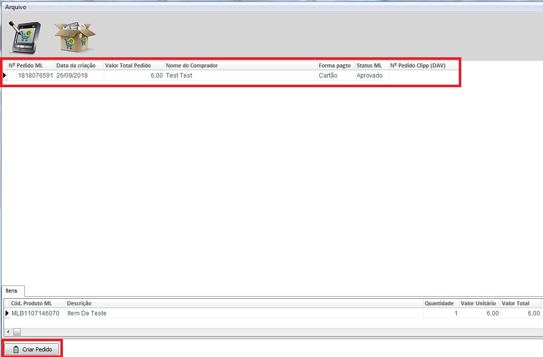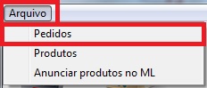 1- Para criar o pedido, é necessário clicar no Menu Arquivo e em seguida em Pedidos, ou clique diretamente no ícone Pedidos no Mercado Livre.