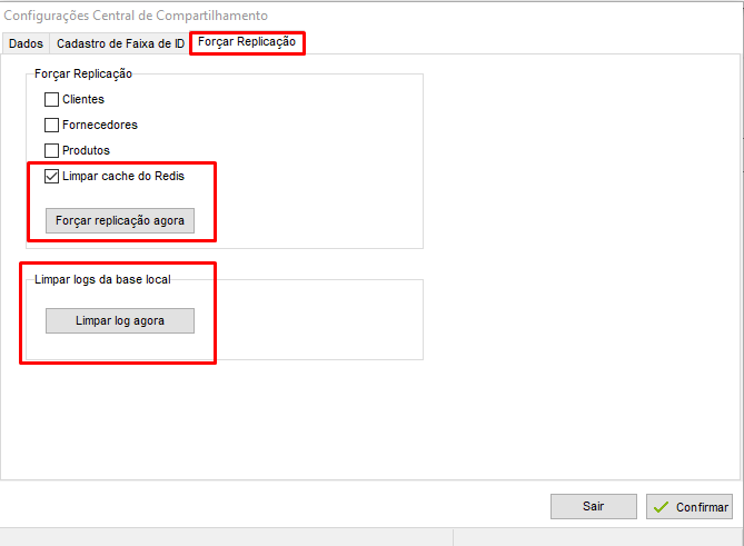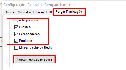 Obs: Caso não apresentem as informações, acesse as configurações da central de compartilhamento - forçar replicação, clique em Limpar log agora e em seguida, marque limpar cache do redis e em seguida clique em Forçar replicação agora;