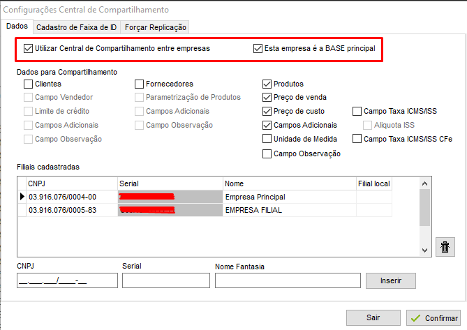 A CENTRAL DE COMPARTILHAMENTO É INDICADA APENAS PARA CLIENTES QUE GARANTEM QUE TODAS AS EMPRESAS DO GRUPO, POSSUEM OS MESMOS CÓDIGOS E DADOS IDÊNTICOS!