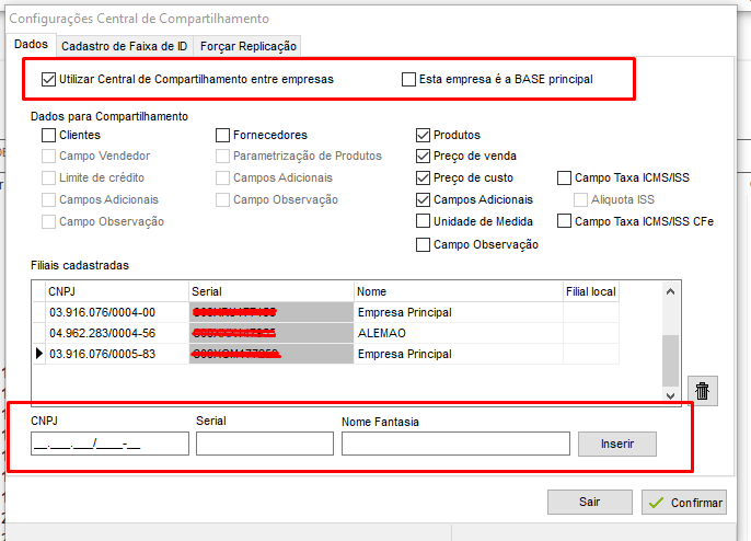 Para realizar a sincronização dos dados, é necessário cadastrar as empresas que irão associar-se na Central de Compartilhamento.