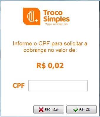 Abrirá a tela em que deverá inserir o CPF do cliente, lembrando que o cliente também deve possuir uma conta no Troco Simples.