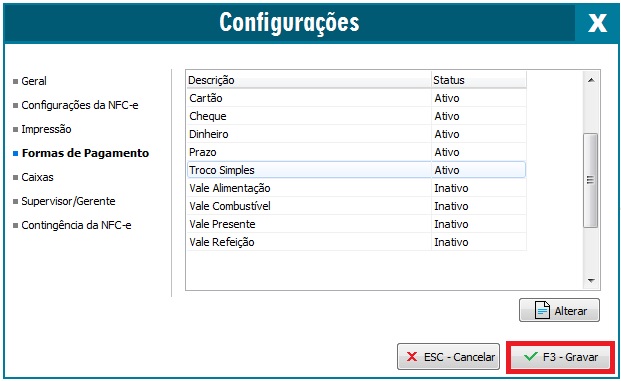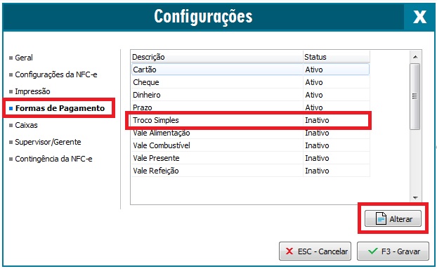 1 - Abrirá a tela contendo as opções de Configurações da NFC-e, clique na opção Formas de Pagamento, clique sobre a opção Troco Simples e em seguida no botão Alterar.