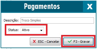 2 - Abrirá a tela de pagamentos, nesta tela, no menu status selecione a opção Ativo e pressione o botão F3 - Gravar nas duas telas.