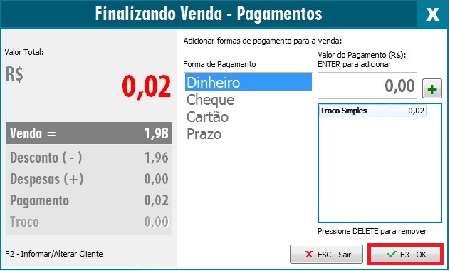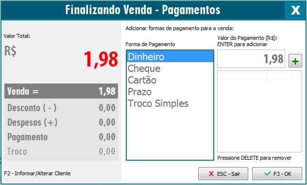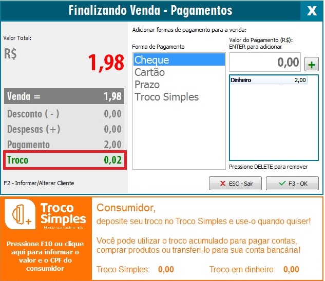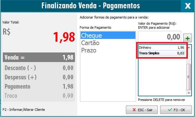 Após realizar as configurações acima, o Troco Simples já está disponível para uso, ao efetuar uma venda, na tela de pagamentos terá a opção Troco Simples. No exemplo, utilizaremos o valor de venda de um produto que custa R$1,98, mas o Cliente pagará R$2,00 em dinheiro.