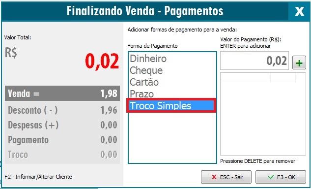 para adicionar o pagamento, ao lado esquerdo mostrará o valor de troco no campo Troco. Na tela abaixo Irá abrir a informação relativa ao Troco Simples.