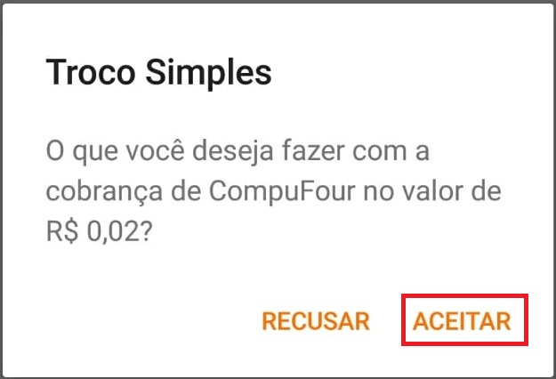 A transferência de valores será confirmada mediante a autorização do cliente, que é efetuada diretamente no aplicativo do Troco Simples, para isso, o cliente terá que autorizar a transferência na hora da compra. Ao efetuar a cobrança conforme tela acima, uma notificação aparecerá no aplicativo do Troco Simples.