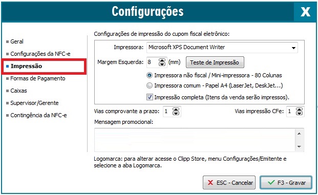Além de configurar o driver da impressora é necessário configurar o tamanho do papel no emissor de NFC-e, para isso, clique em