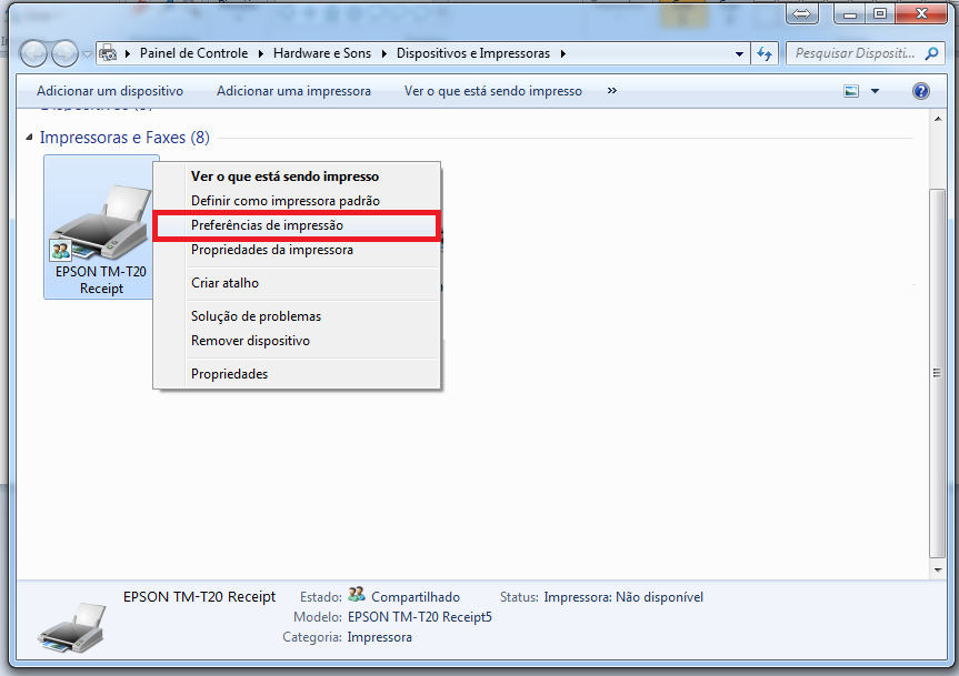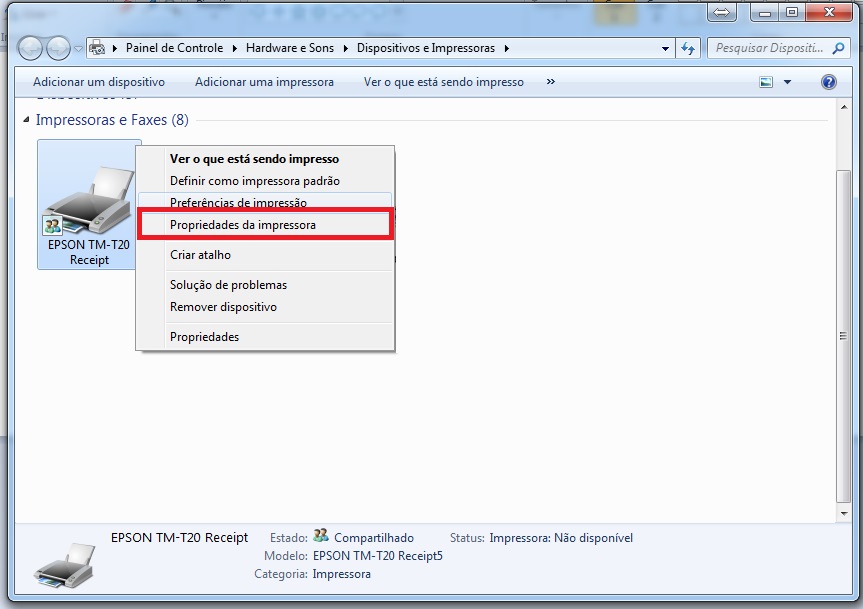 É necessário também alterar algumas configurações nas propriedades da impressora. Para isso, clique novamente com o botão direito do mouse sobre o driver, e em seguida, clique em Propriedades da Impressora.