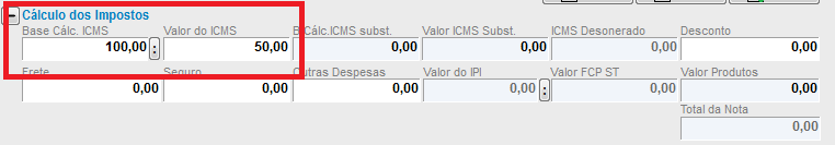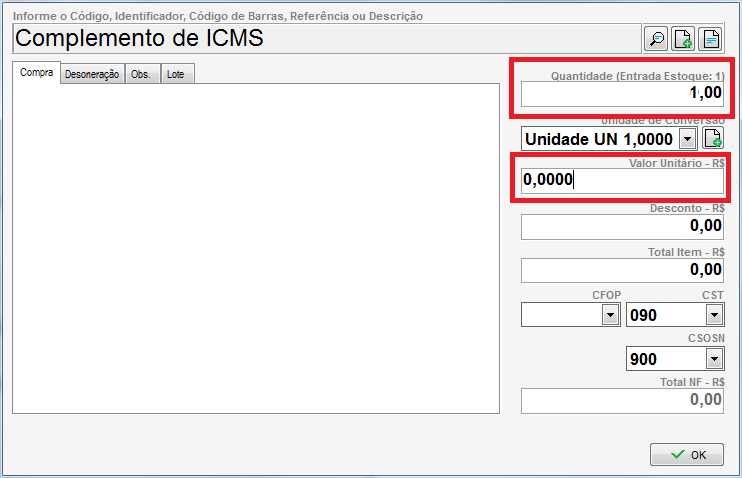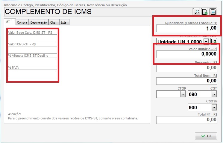 • Adicionando este valor, serão criados os campos de ICMS ST, deverá lançar os valores de ICMS ST diretamente no item Complemento de ICMS incluso na nota. A quantidade pode ser 1 e o valor zero.