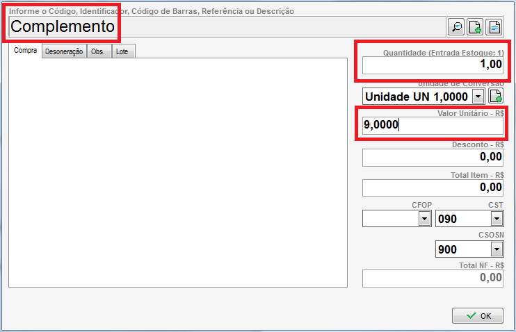 Caso queira complementar valores, basta cadastrar e lançar na nota um item com nome complemento (ou complemento de valores), a finalidade da nota complementar permanecerá conforme explicação anterior. A diferença é que neste tipo de complemento, você deverá lançar o valor unitário do item com o valor faltante na nota anterior.