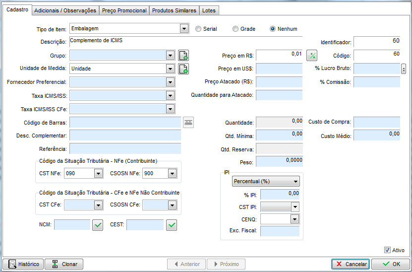 • CEST: Caso seja um complemento de Substituição Tributária, deve ser verificado com a contabilidade um código válido para as operações com Substituição Tributária.