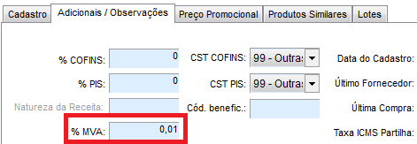 Para criar a nota de complemento de ICMS ST, após lançar a nota conforme exemplo acima, no cadastro do complemento de ICMS no estoque, na aba adicionais/observações informe o MVA em 0,01.