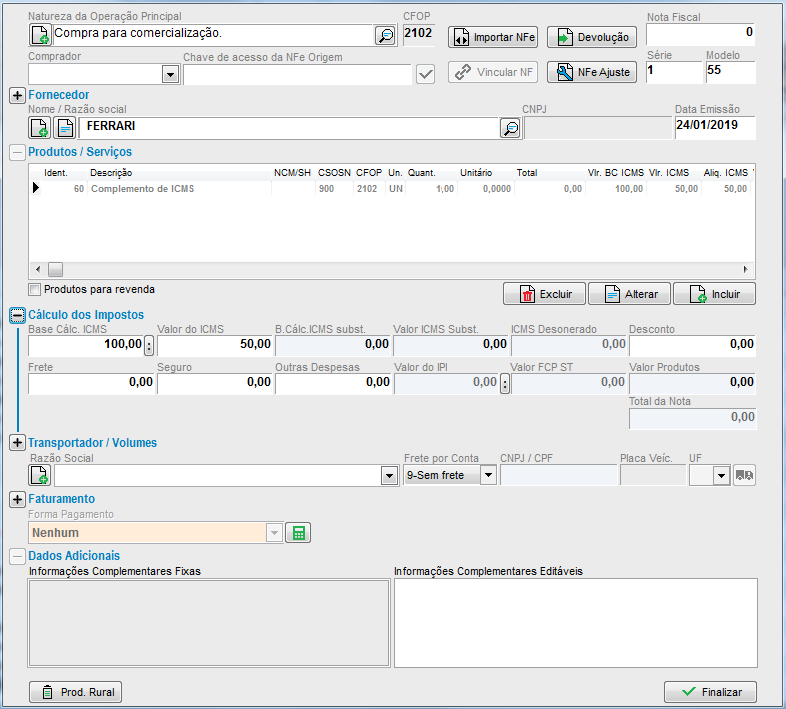 Emitindo nota fiscal de Entrada de Complemento de ICMS e ICMS ST. (Ou de Valores)