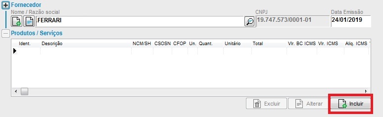 • Informe o Fornecedor da Nota e clique em Incluir para informar o Produto: