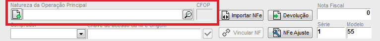 • Após, será necessário informar a Natureza de Operação Principal (CFOP), de acordo com a orientação da contabilidade. Caso não possua o CFOP cadastrado, poderá clicar no botão  disponível ao lado do campo para cadastrar uma nova Natureza. Recomendamos utilizar um CFOP que não permita movimentar estoque. (Verifique com o contador).