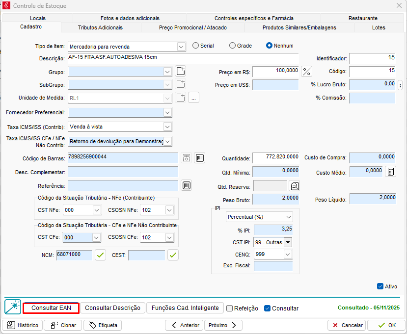 Ao lado inferior direito apresentará a data da consulta, caso for um item já cadastrado no estoque, poderá utilizar a opção