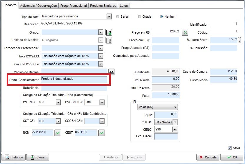 Para que essa tag apresente no XML, é necessário configurar corretamente o cadastro do produto, para isso, abra o cadastro do item que deseja informar o infAdProd e insira a Descrição Complementar com o conteúdo a ser apresentado no XML.