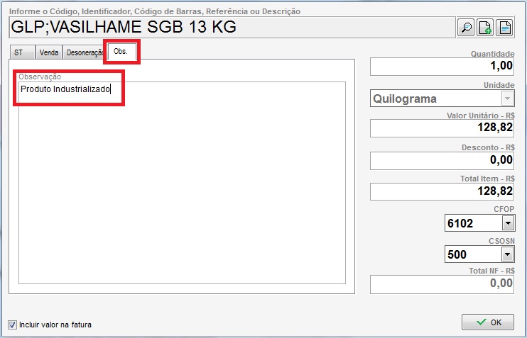 Em seguida, na emissão da nota, no momento do lançamento do item, é necessário informar o conteúdo cadastrado anteriormente no campo de observações, para isso, clique no botão OBS e pressione a tecla F2 para colar o conteúdo no campo.