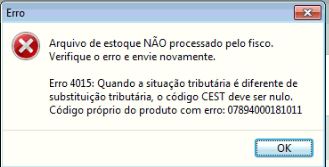 Erro 4015: Quando a situação tributária é diferente de substituição tributária, o código CEST deve ser nulo - Ao enviar estoque ao fisco