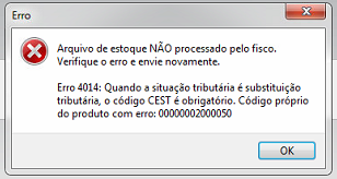 Erro 4014: Quando a situação tributária é substituição tributária, o código CEST é obrigatório - Ao enviar estoque ao fisco