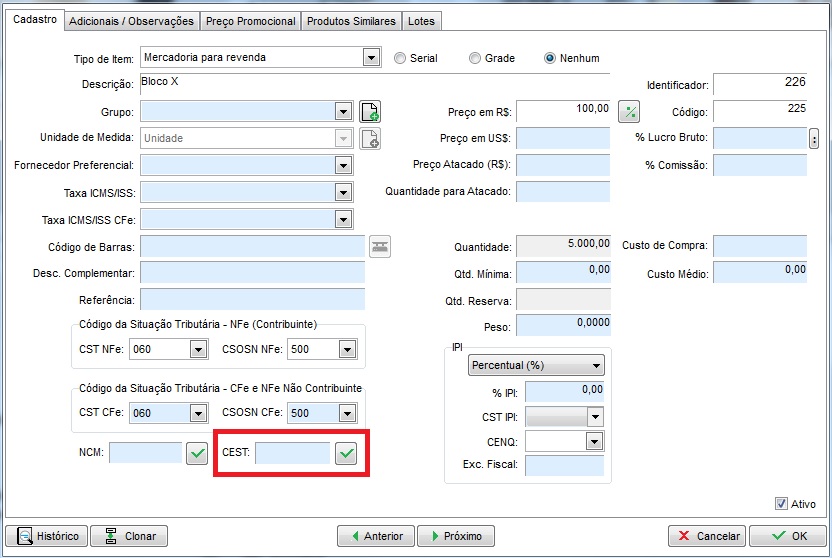 IMPORTANTE: O CEST (Código Especificador da Substituição Tributária) deverá ser conferido junto a contabilidade!