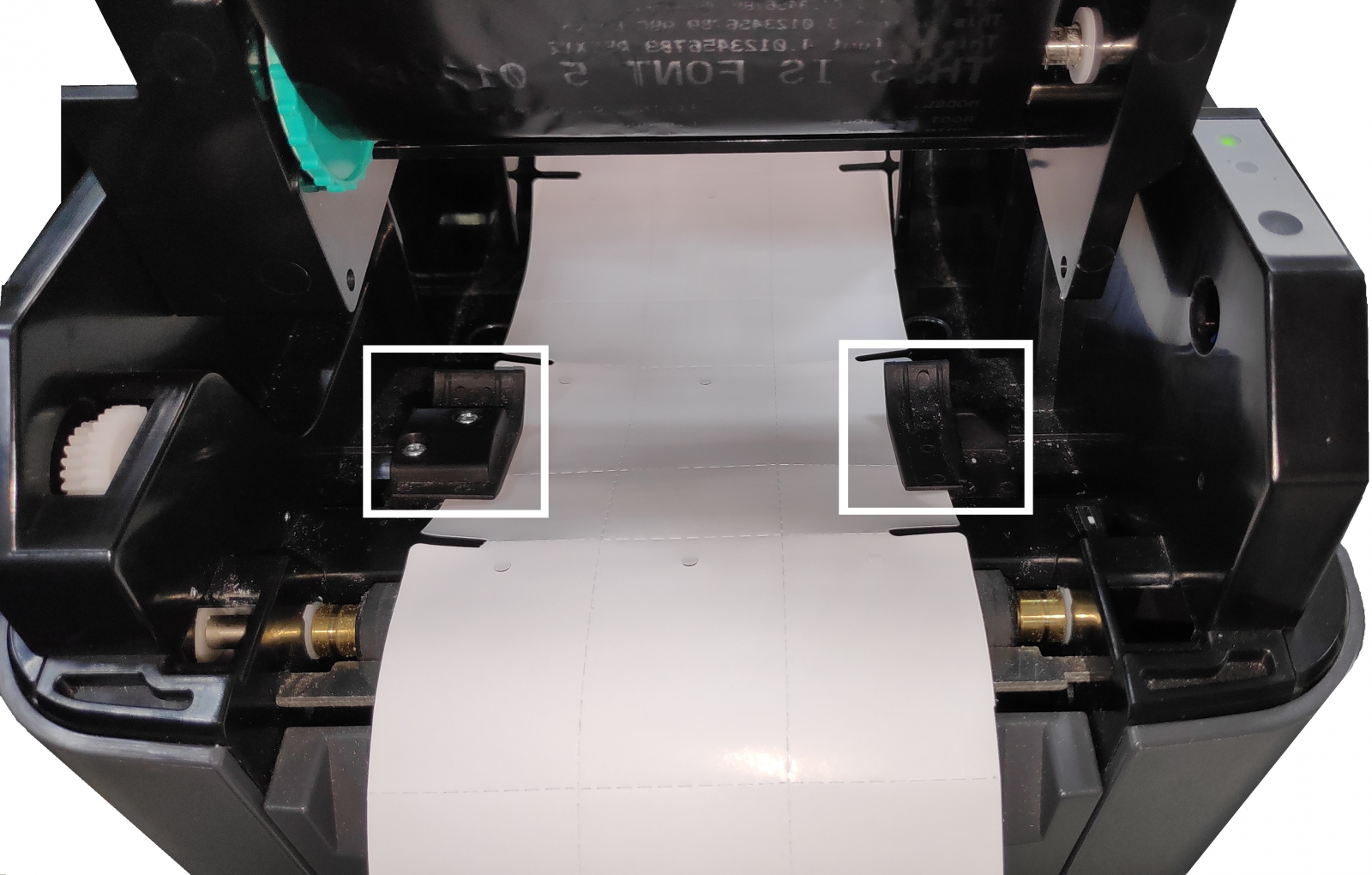 Para ajustar o papel, abra o compartimento principal da impressora e em seguida o secundário, existe o sensor logo na parte central, é aí que deverá alocar o papel e ajustar o sensor de forma que prenda o papel, atentando-se em não o deixar muito apertado, deixando-o correr livremente.