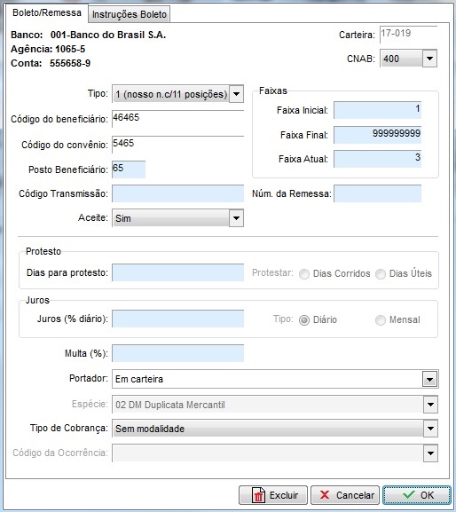 Obs: Os campos referentes as Faixas, Multa, Juros e Dias para protesto estarão disponíveis apenas para alguns Bancos.