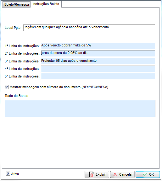 Os dados devem ser preenchidos corretamente na aba Boleto/Remessa e também na aba Instruções Boleto