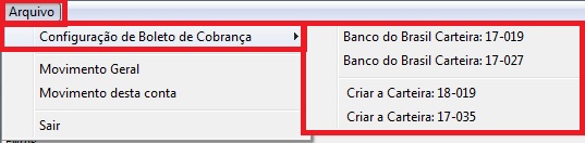 Acesse o módulo de Bancos e selecione a conta bancária desejada, clique no menu Arquivo - Configuração de Boleto de Cobrança e selecione a carteira desejada (poderá variar conforme o banco).