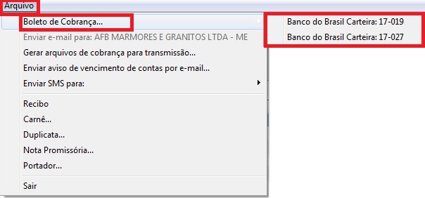 Após selecionar a conta que deseja gerar o boleto, no módulo de contas a receber clique no menu Arquivo - Boleto de Cobrança e selecione a carteira (somente serão apresentadas as carteiras já configuradas):