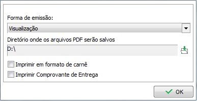 Para finalizar, selecione a Forma de Emissão e Diretório onde os arquivos PDF serão salvos. É opcional imprimir o comprovante de entrega do boleto além da possibilidade de gerar os boletos em formato de carnê.