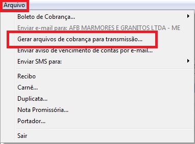 Para gerar o arquivo de remessa para cobrança dos boletos, acesse o módulo de contas a receber  clique no Menu Arquivo - Gerar arquivo cobrança para transmissão: