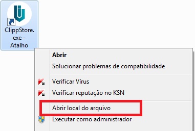 Opcionalmente poderá localizar os arquivos diretamente na pasta principal de instalação do sistema, para isso, minimize o Clipp Store, clique com o botão direito do mouse no ícone dele e vá até a opção Abrir local do arquivo.