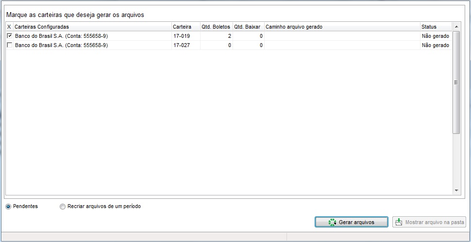 Em seguida serão listadas na tela todas as carteiras configuradas e a respectiva quantidade de boletos gerados para cada uma.