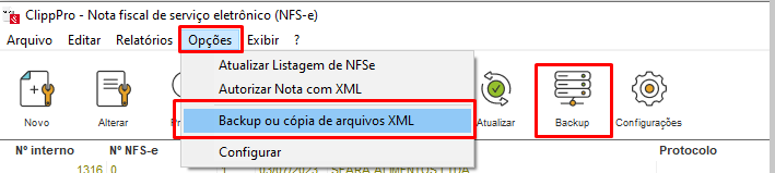 Após abrir, clique no botão Opções - Backup ou cópia de arquivos XML
