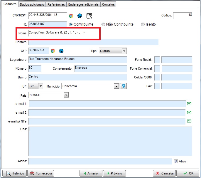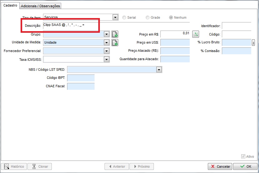 Após abrir o Serviço, verifique e apague os caracteres especiais nos campos do cadastro: